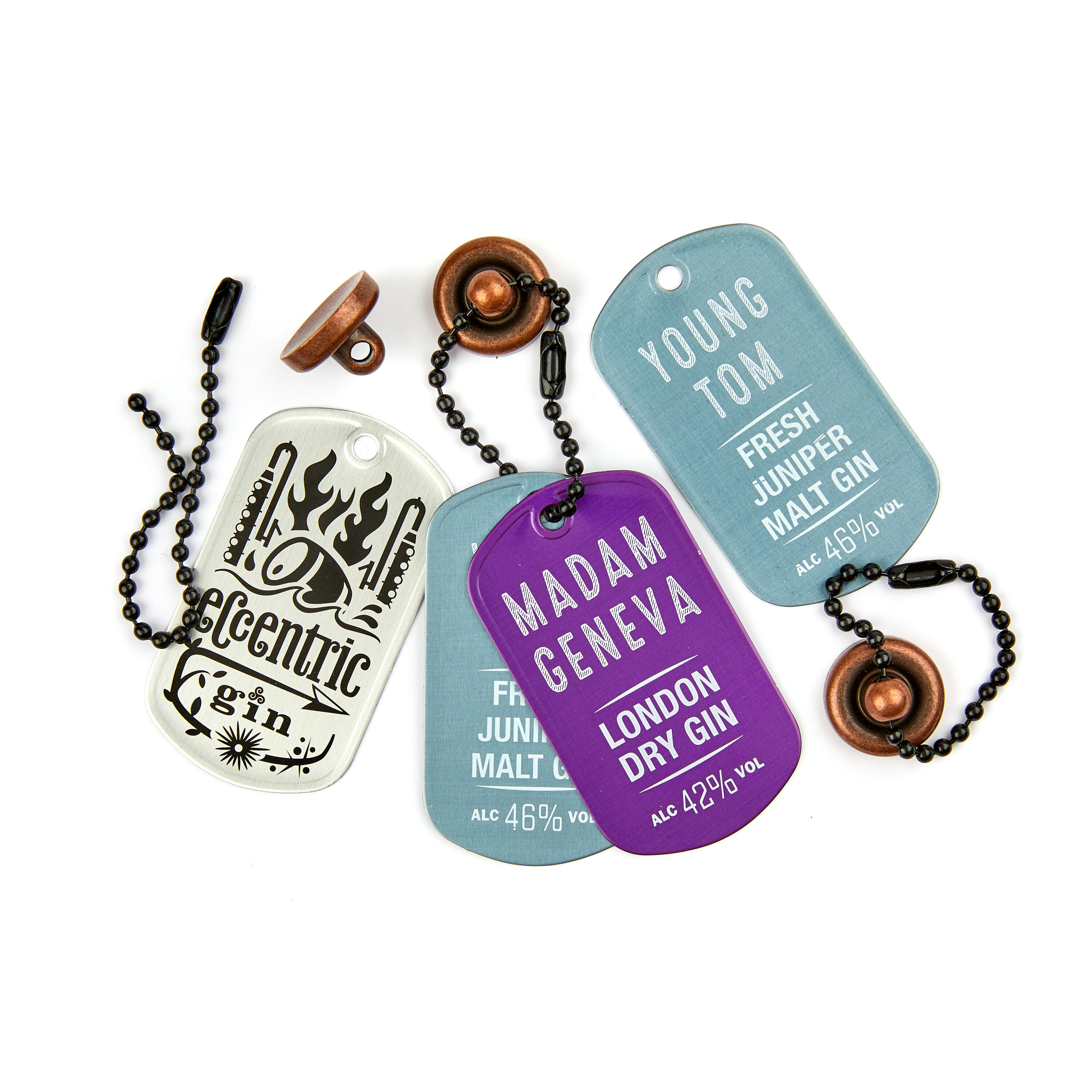 Dare to be different, Eccentric Gin came to us bringing with them their passion for Welsh folklore, people and places, all of which light the fire for their gins. Naturally, they needed no ordinary hangtag. Presented on the body of their bottles is now emblazoned a bronze pop rivet style fastener with ball and chained tag performing the purpose of displaying both their iconic logo and identifying the individual blend or flavour.
